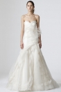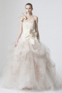 Description: Nude coloured gown features crystal beadwork at bust; blush hand-painted floral tulle draped skirt. Fabric: Tulle Website: www.verawangonweddings.com