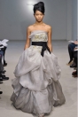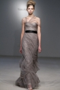 Description: Gown features a draped bodice accented with a contrasting black belt. Fabric: Tissue Organza Website: www.verawang.com